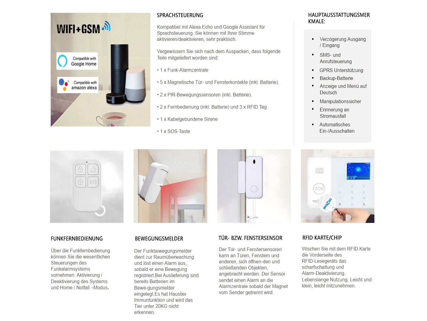 Haus-Sicherheitsalarm mit Sprachsteuerungsfunktion. Er ist kompatibel mit Amazon Alexa/Echo und Google Home, WiFi-Verbindung, kompatibel und funktioniert nur mit einer Bandbreite von 2,4 GHz. Aktuell werden 5-GHz-Netzwerke nicht unterstützt.