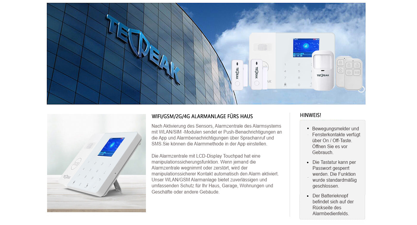 Haus-Sicherheitsalarm mit Sprachsteuerungsfunktion. Er ist kompatibel mit Amazon Alexa/Echo und Google Home, WiFi-Verbindung, kompatibel und funktioniert nur mit einer Bandbreite von 2,4 GHz. Aktuell werden 5-GHz-Netzwerke nicht unterstützt.
