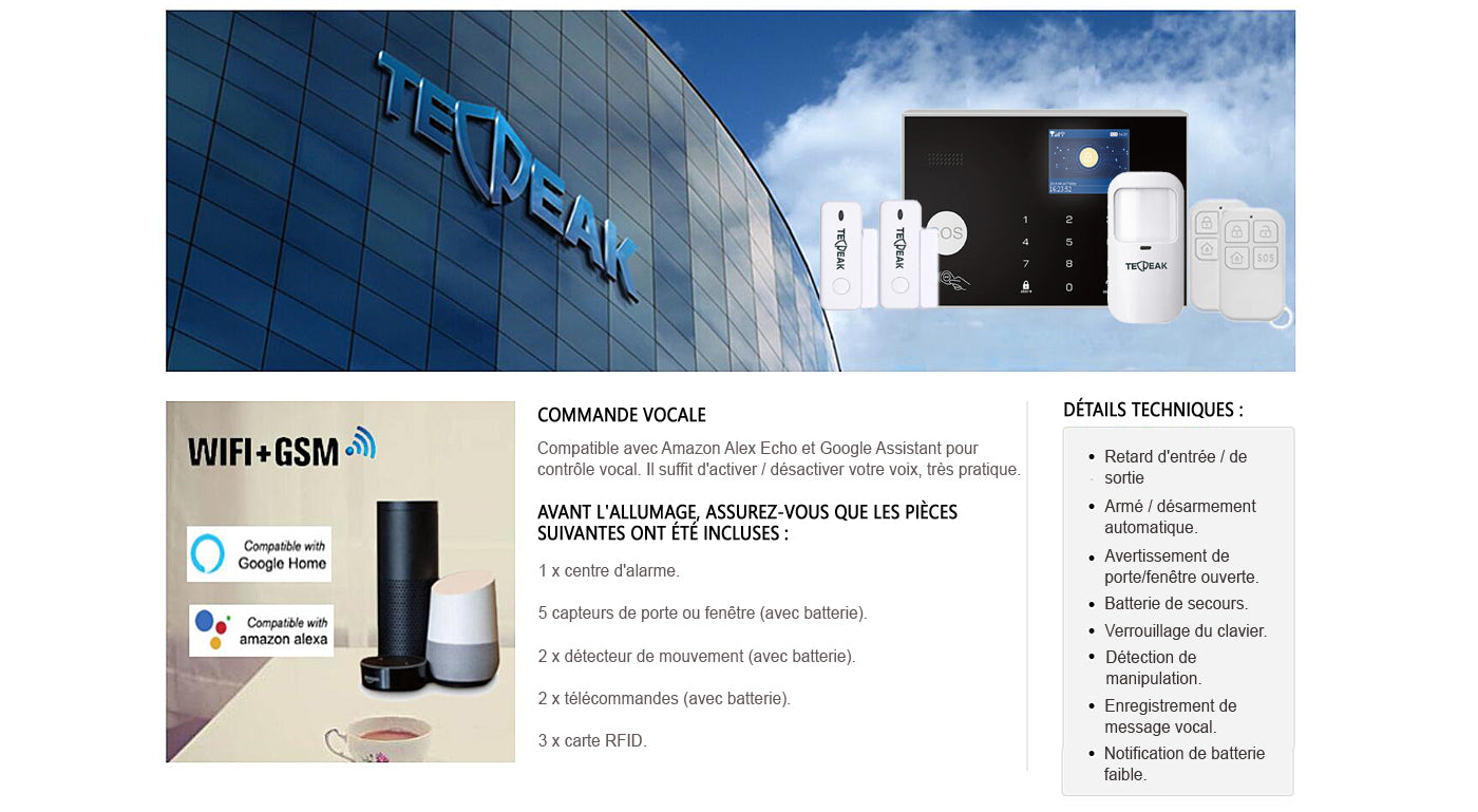 Alarme de sécurité domestique avec fonction de contrôle vocal. Compatible avec Amazon Alexa/Echo et Google Home, connexion WiFi, compatible et ne fonctionne qu'avec une bande passante de 2,4 GHz. Actuellement, les réseaux 5 GHz ne sont pas compatibles.