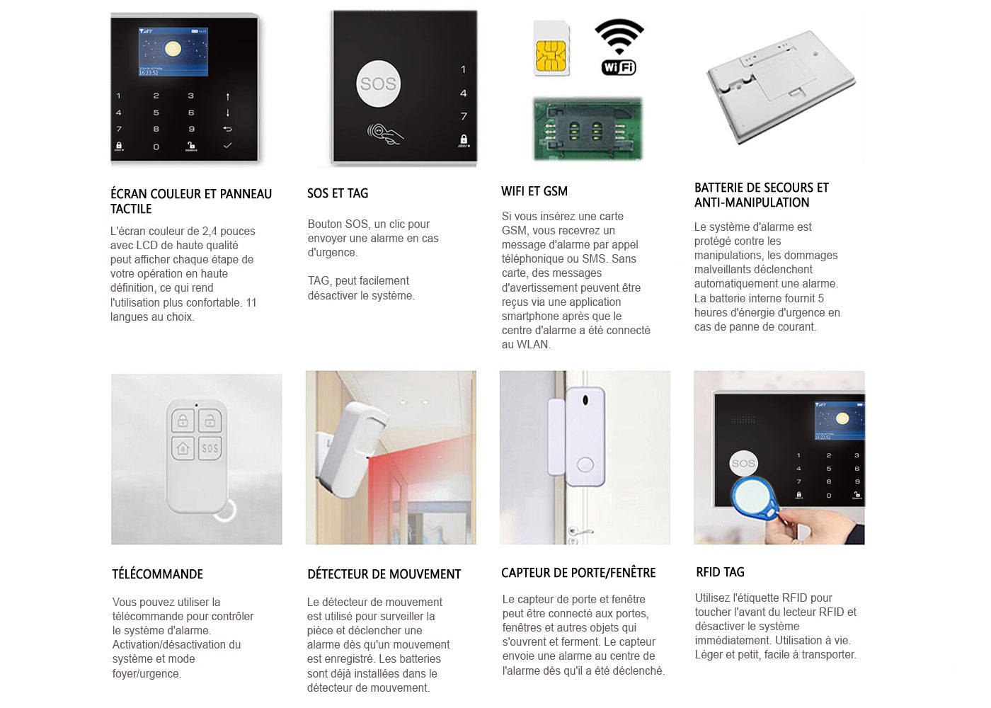 L'alarme de maison intelligente WiFi / GSM peut être étendue à tout moment, 100 capteurs peuvent être intégrés, y compris : capteurs de sécurité domestique pour portes et fenêtres, détecteurs de mouvement, détecteurs de fumée, sirène d'alarme externe, étiquette RFID, télécommandes, etc.