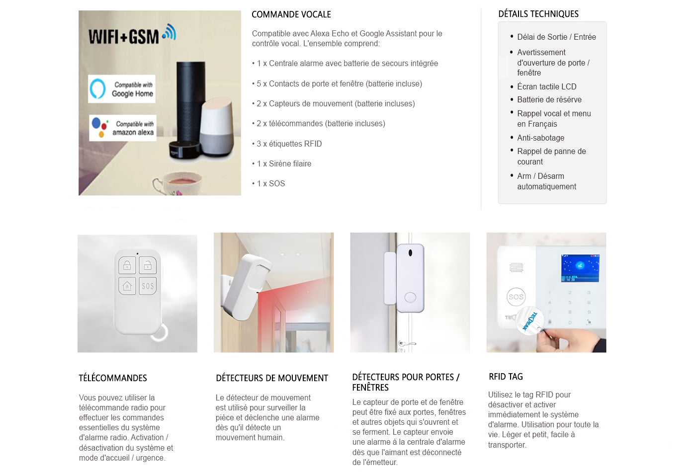 Alarme de sécurité domestique avec fonction de contrôle vocal. Compatible avec Amazon Alexa/Echo et Google Home, connexion WiFi, compatible et ne fonctionne qu'avec une bande passante de 2,4 GHz. Actuellement, les réseaux 5 GHz ne sont pas compatibles.
