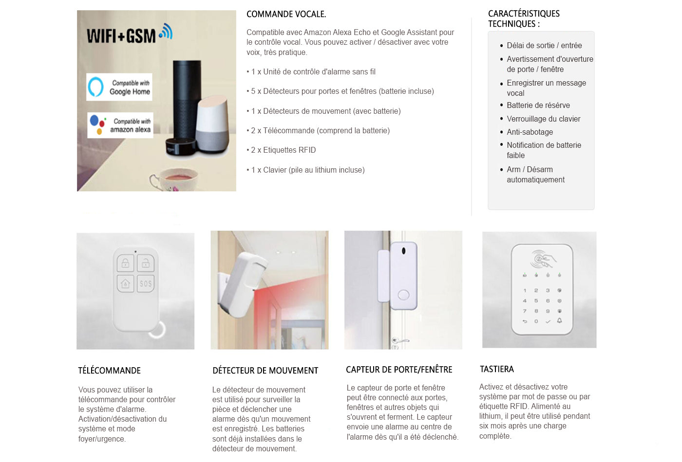 L'alarme maison Wifi / GSM dispose d'une fonction de contrôle vocal. Elle est compatible avec Amazon Alexa / Echo et Google Home, connexion Wi-Fi, compatible et ne fonctionne qu'avec une bande passante de 2,4 GHz. Les réseaux 5 GHz ne sont pas compatibles actuellement.
