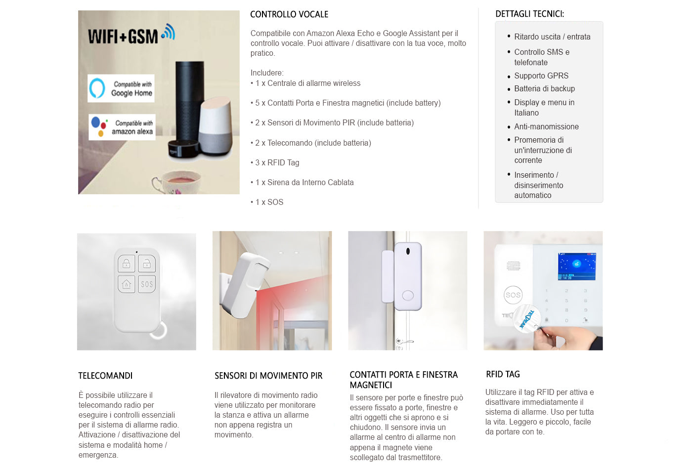 Allarme di sicurezza domestica con funzione di controllo vocale. Compatibile con Amazon Alexa/Echo e Google Home, connessione WiFi, compatibile e funziona solo con una banda di 2,4 GHz. Attualmente, le reti a 5 GHz non sono supportate.