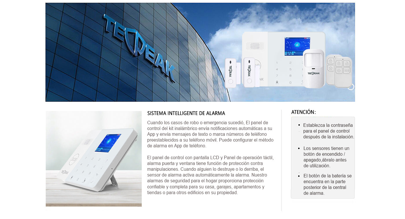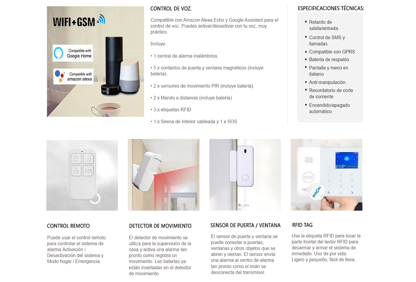 Alarma de seguridad doméstica con función de control de voz. Es compatible con Amazon Alexa/Echo y Google Home, conexión WiFi, compatible y solo funciona con un ancho de banda de 2,4 GHz. Actualmente, las redes de 5 GHz no son compatibles.